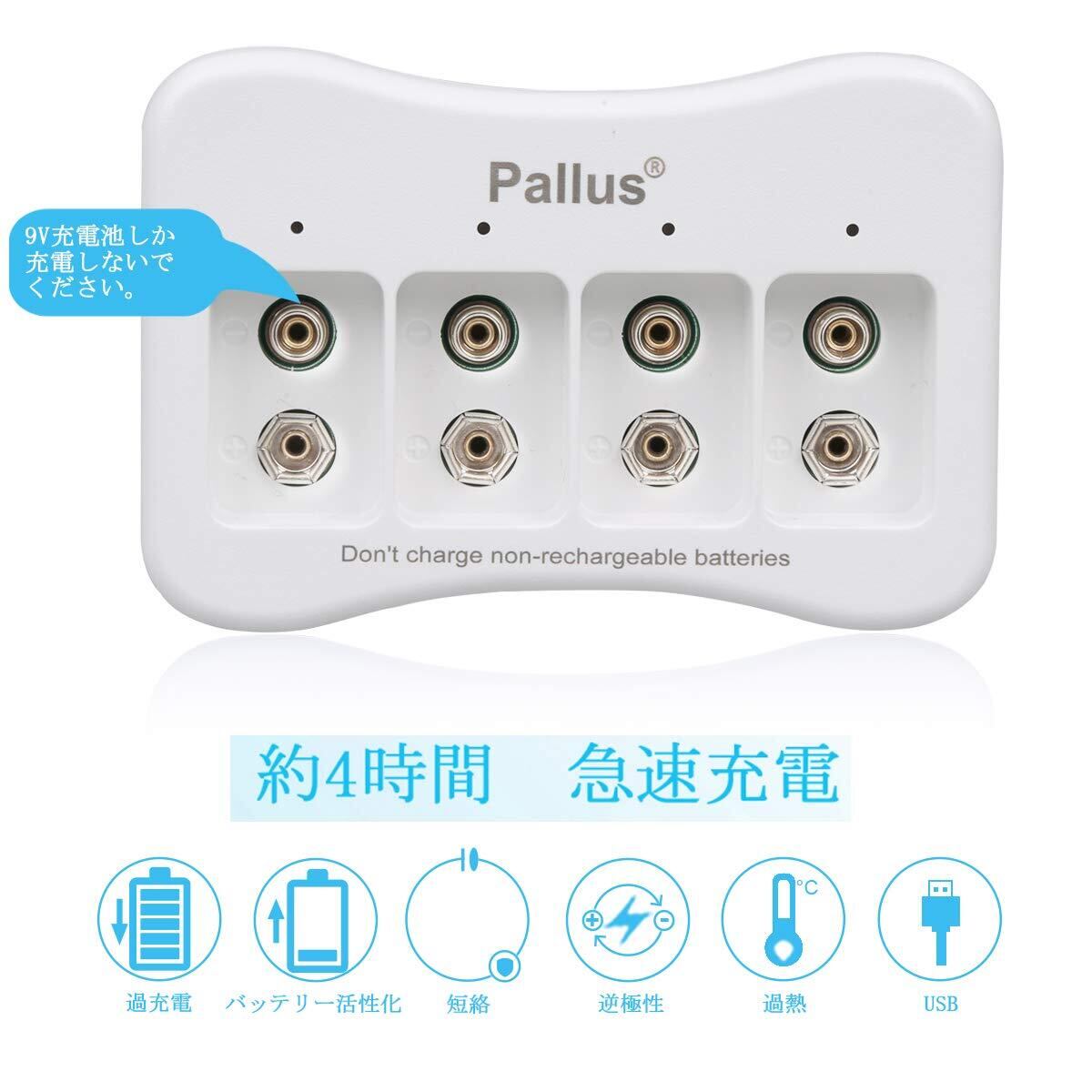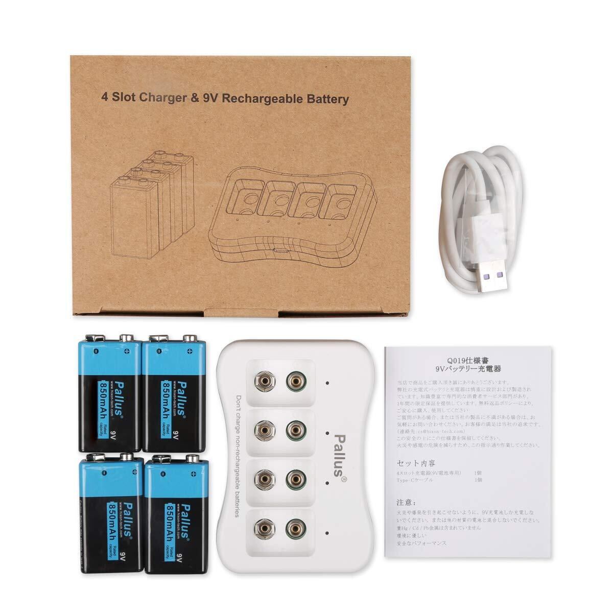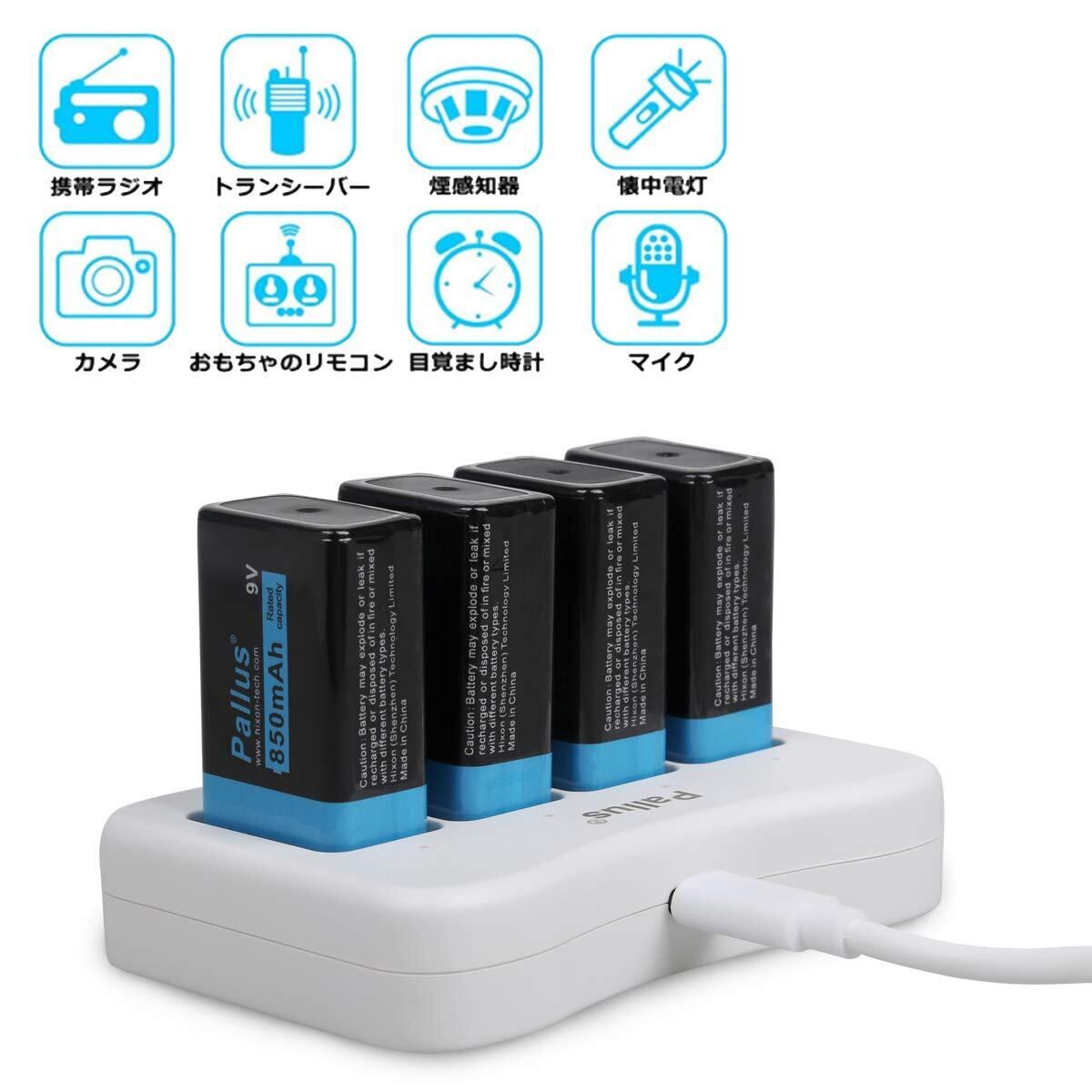 9v電池充電式 6P電池4個、大容量850mAh、充電式9Vバッテリーセット、長持ちする電力、スマートタイプC入力充電器、2時間の急速充電、6F22スクエア、煙探知機、火災警報器、エレキギター、ラジオ、おもちゃに適しています