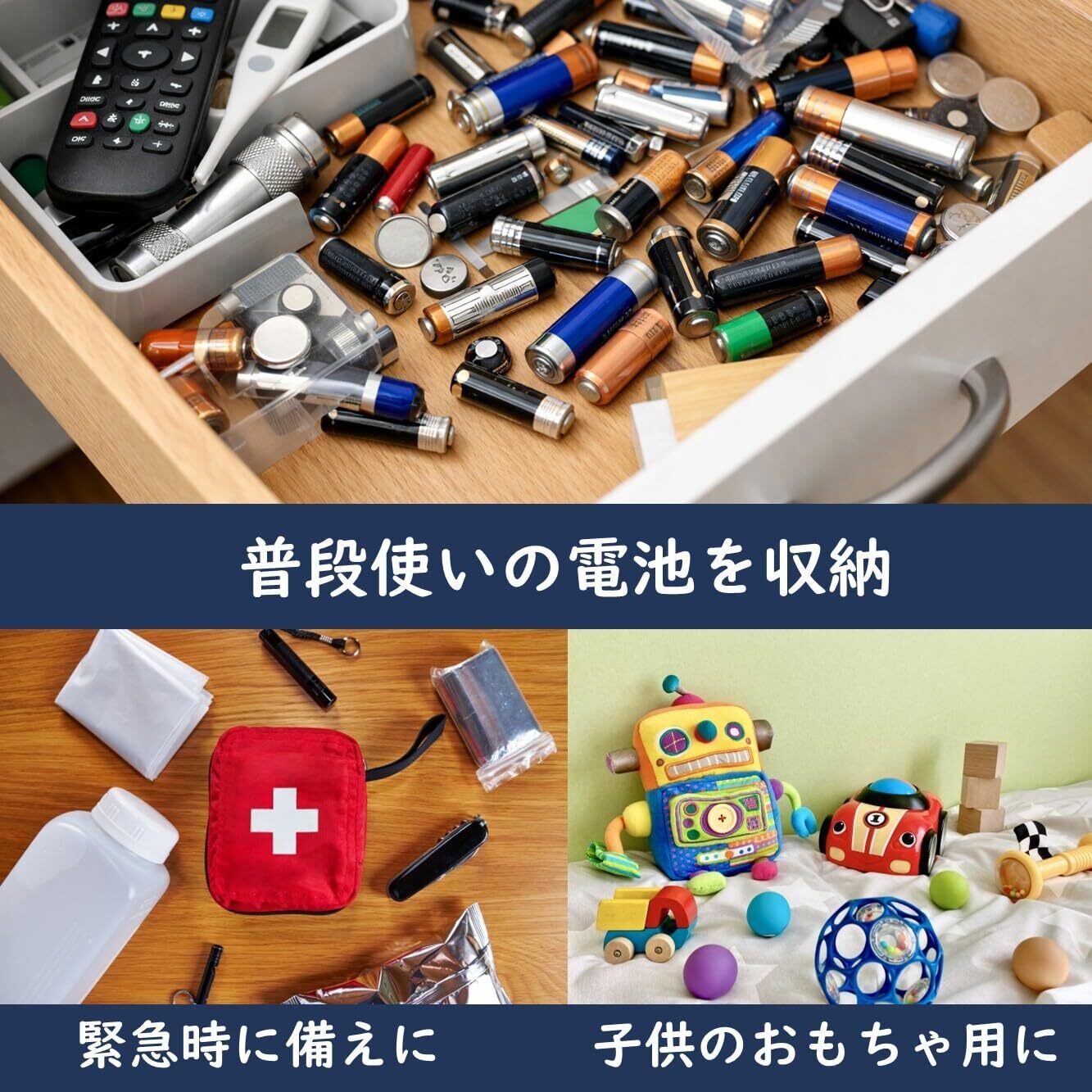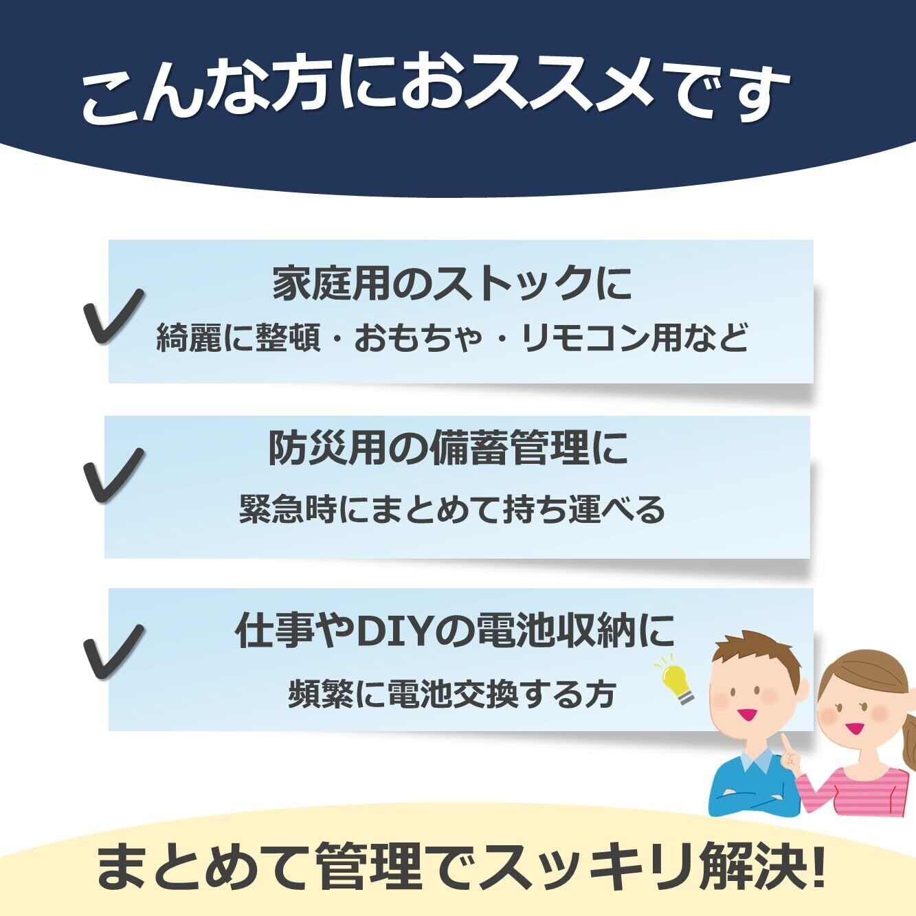 【防災・非常時にも安心|必要な電池をすぐ確保】 災害時や停電時、電池が見つからないのは致命的です。本ケースにまとめて保管しておくことで、懐中電灯・ラジオ・モバイル機器用の電池を即座に確保可能。日常使いだけでなく、防災備蓄としても活躍します。「いざという時に困らない」という安心感を、普段から備えることができます。