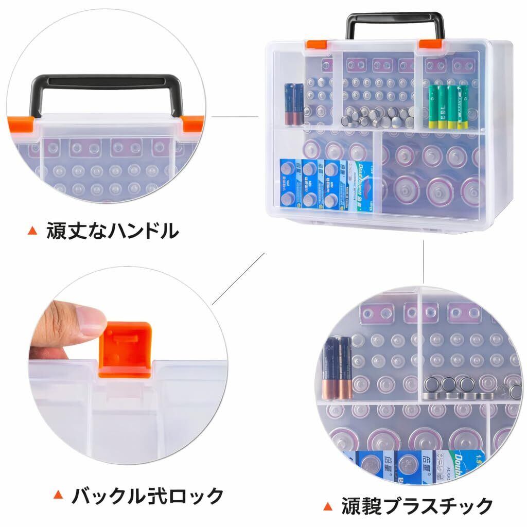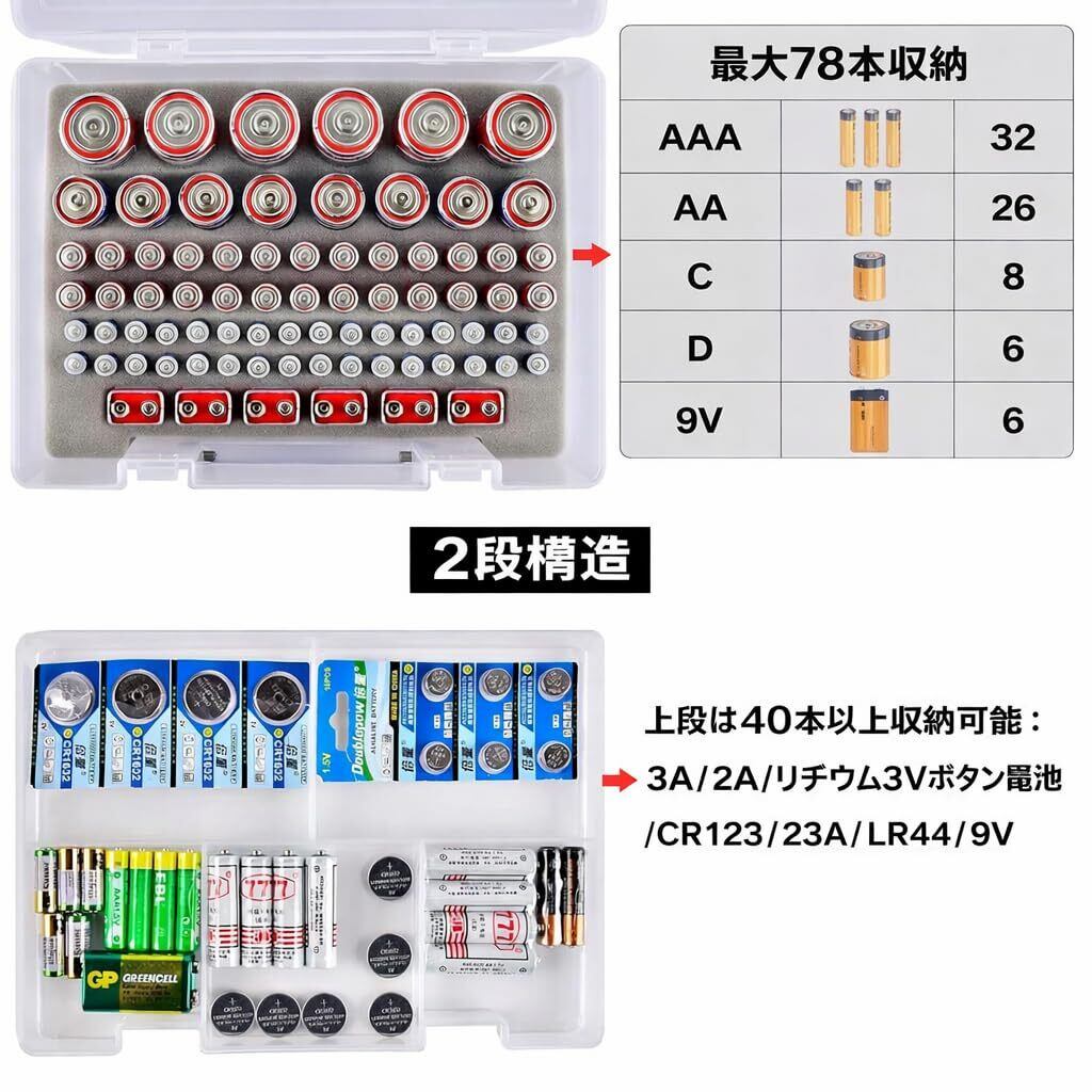 120本以上の大容量収納:下段フォーム穴でしっかり固定収納 &さらに上段にはボタン電池・小型電池をまとめて整理可能(合計120本以上、組み合わせにより変動)サイズ:約25.4×19.1×10.2cm