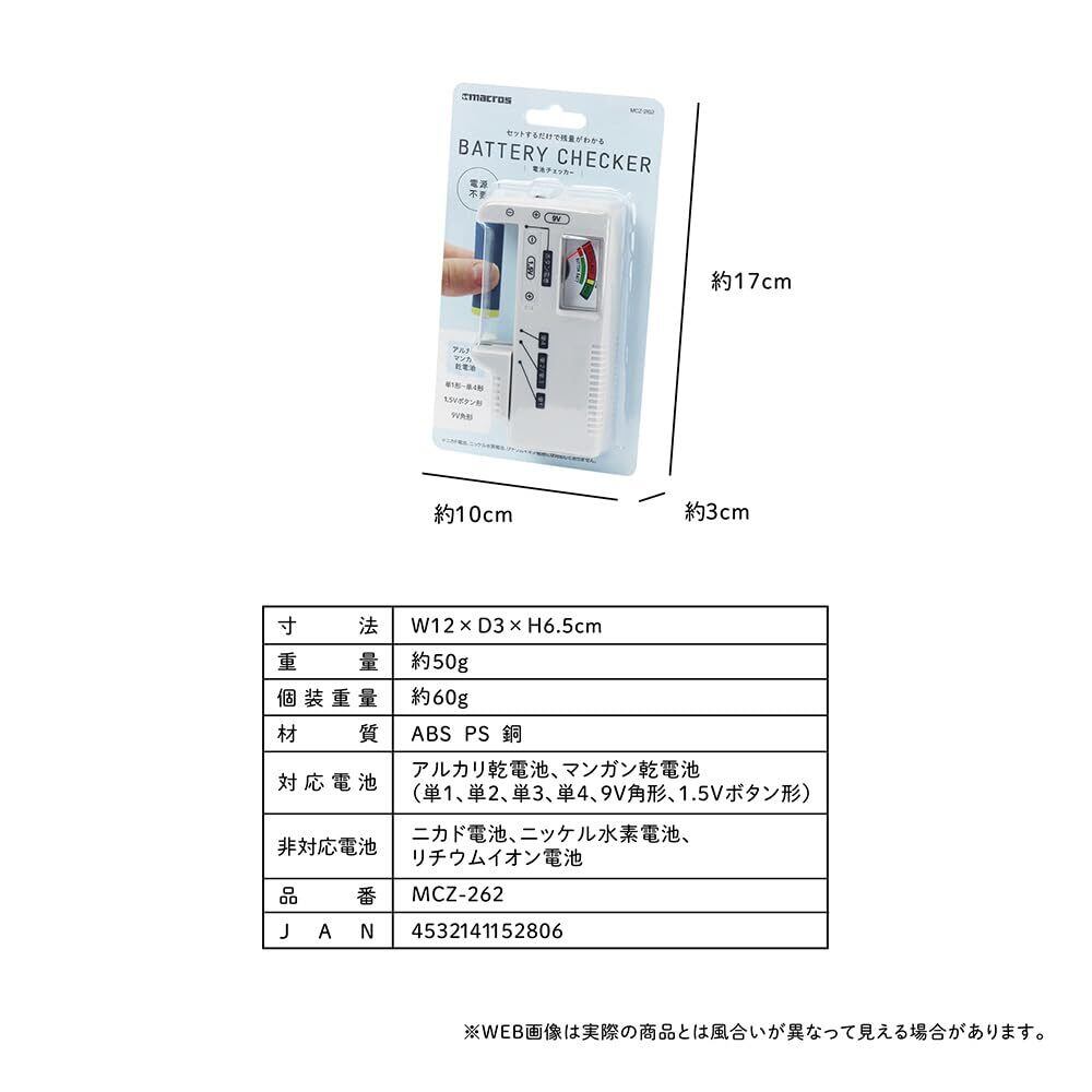 寸法:W12×D3×H6.5cm、 重量:約50g、 個装重量:約60g、 材質:ABS PS 銅、 対応電池:アルカリ乾電池、マンガン乾電池、 :(単1、単2、単3、単4、9V角形、1.5Vボタン形)、 非対応電池:ニカド電池、ニッケル水素電池、リチウムイオン電池、