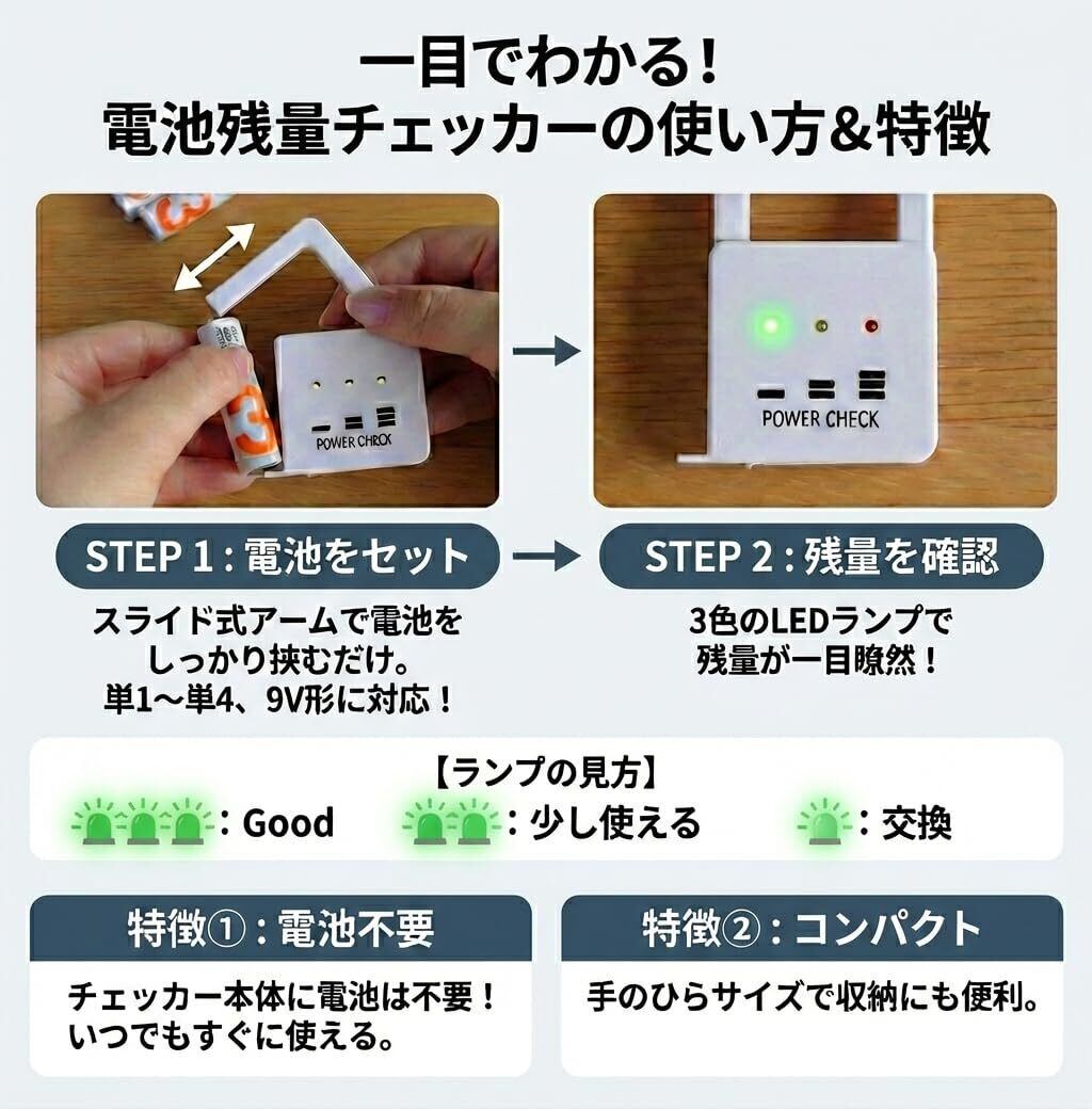 リモコン・おもちゃ・懐中電灯など、手元にある乾電池の「まだ使える?」をサッと確認できる電池残量チェッカーです。 乾電池をセットして、LEDの点灯数で残量の目安を3段階で表示 (3灯:60〜100%/2灯:30〜60%/1灯:10〜30%)。単1〜単5まで幅広い乾電池サイズに対応しているので、 家の電池整理や交換タイミングの判断にも便利です。 ※表示は目安です。電池の種類・温度・状態により差が出る場合があります。