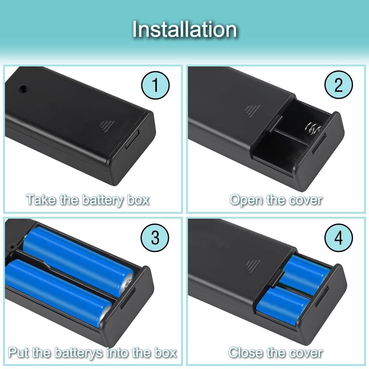 [バッテリーの取り付け] 1.指で2 AAボックスホルダーのカバーを押し開きます。 2.お持ちの2つのバッテリーをバッテリースロットに配置します。 3.カバーを閉じます。 (必要に応じてネジを締めるかどうか)