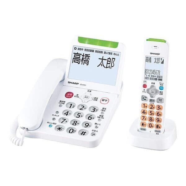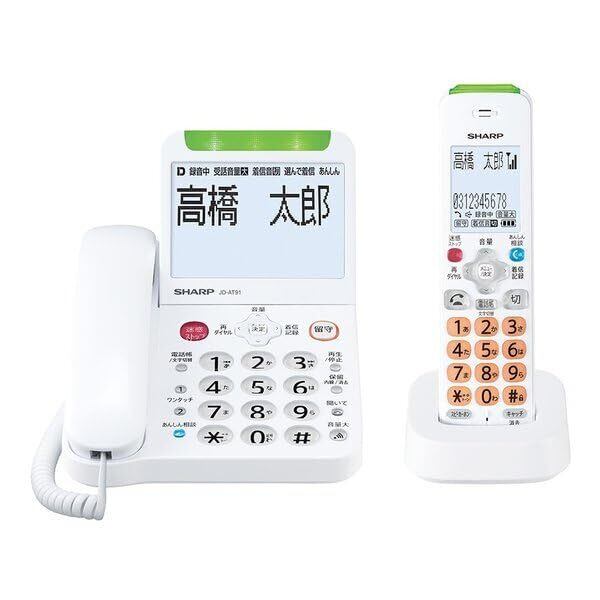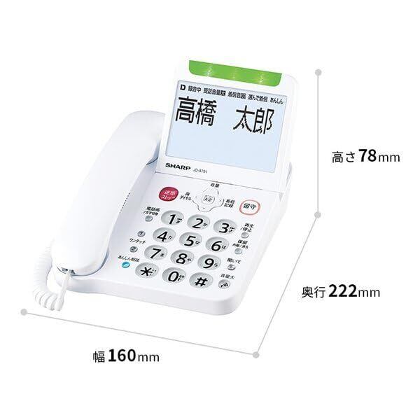 ワンタッチで受話音量が大きくなるのに加え、シニアの方が聞き取りにくい、高音域を強調したはっきりとした音になります。大きくて見やすい「漢字液晶」。あやしい電話からしっかりガードする「防犯機能」が設定済み。着信音が鳴る前に警告するので、気づかないうちに迷惑電話を撃退できます。また警告されても電話を切らない相手には、名前を確認する自動メッセージを流すので、相手を確認してから電話に出るか判断できます。シャープの電話機なら、2重の対策で迷惑電話をしっかり防ぎます。電話をかけてきた相手を着信ランプの色でお知らせします。本体メモリーに、たっぷり120分(1件10分まで、最大100件)録音できます。もしメモリーがいっぱいになっても、古い録音から自動的に上書きされるので、録音できなくなることはありません。着信中や通話中、留守応答中でもボタンを押すだけで、メッセージを流し、電話を切ります。スピーカーを通して相手の声を聞くことが詐欺対策に有効とされています。あやしい電話を受けた後は、家族や警察署などあらかじめ登録した信頼できる相手へワンタッチで電話して相談できます。