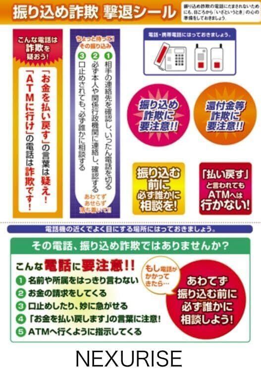 振り込め詐欺撃退シールが付属しておりますので、電話機や電話機の周囲に貼って詐欺被害防止にお役立てください。(B5サイズ台紙に7種類の注意喚起のシールがカットされております)