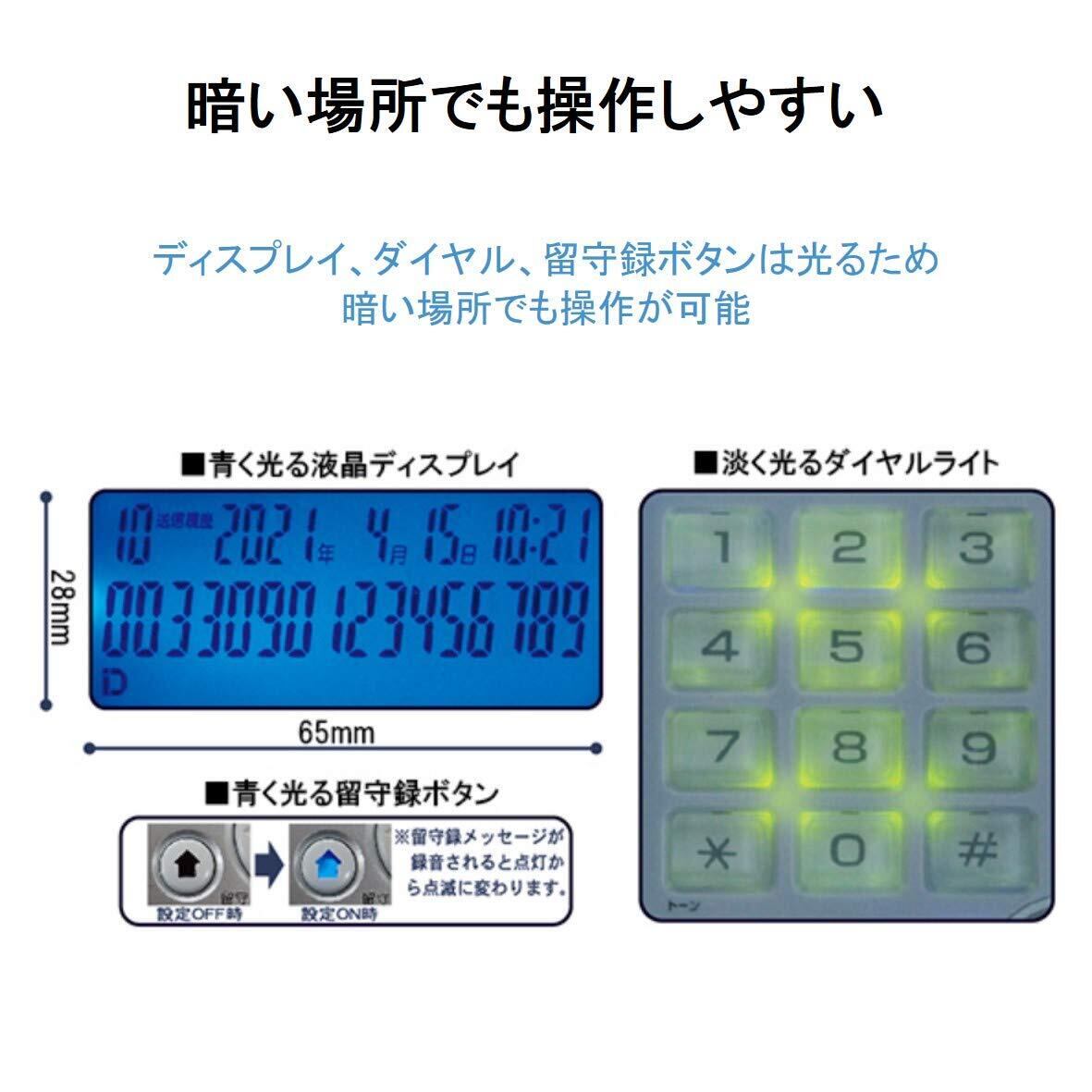 発信番号液晶表示16桁、日付・時計表示する青く光る液晶ディスプレイ。光る!「ダイヤルライト」、「不在時着信ランプ」、「留守録ボタン」。