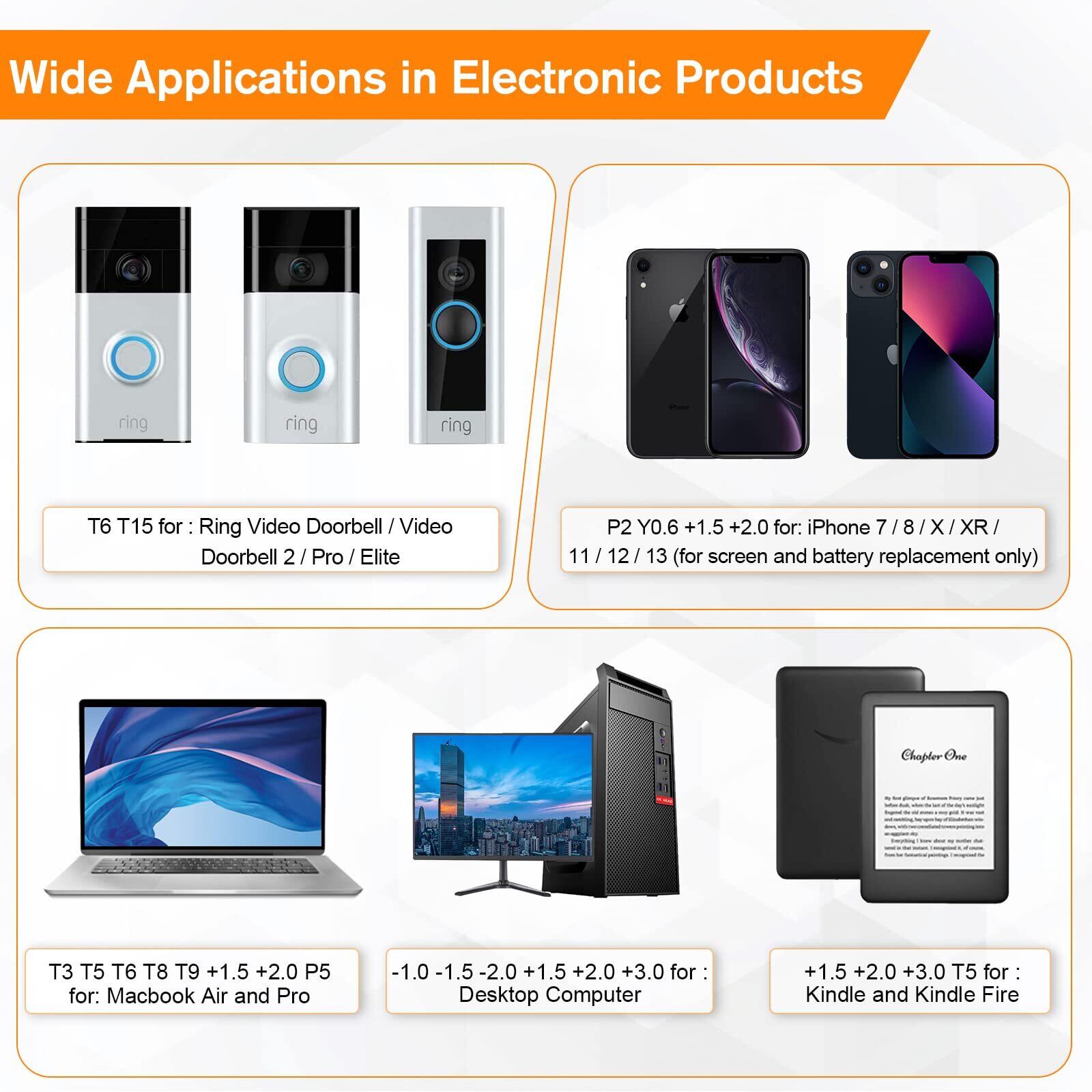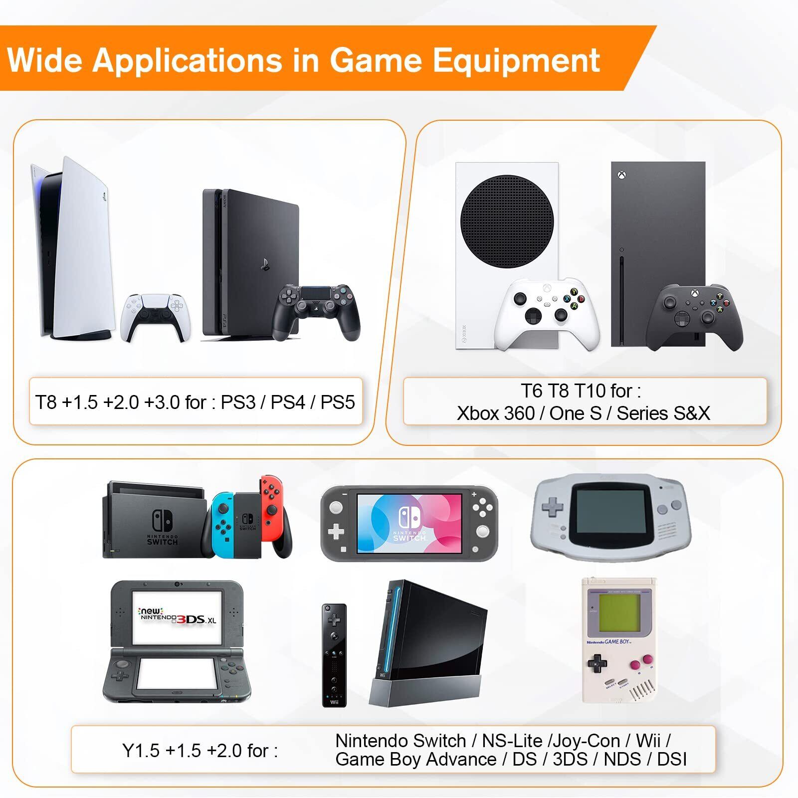 【幅広い用途】-- P2 Y0.6 +1.5 +2.0は、iPhone 7/8 / X / XR / 11/12/13に適しており、画面と電池の交換のみに適しています。 T8 +1.5 +2.0 +3.0はPS3 / PS4 / PS5に適しています。 T6 T8 T10は、Xbox 360 / One S / Series S&Xに適しています。 Y1.5 +1.5 +2.0は、Nintendo Switch / NS-Lite / Joy-Con / Wii /3DSに適しています。 T6 T15は、リングビデオドアベル/ビデオドアベル2 / Pro/Eliteに適しています。 T3はFitbitリストバンドに適しています。 T8は折りたたみナイフに適しています。T3 T5 T6 T8 +1.5 +2.0 P5 MacbookAirおよびProに適しています。 -1.0 -2.0 +1.5 +2.0 +3.0は、デスクトップコンピュータ/時計/ガラスに適しています。 +1.5 +2.0 +3.0 T5はKindle Fireに適しています。